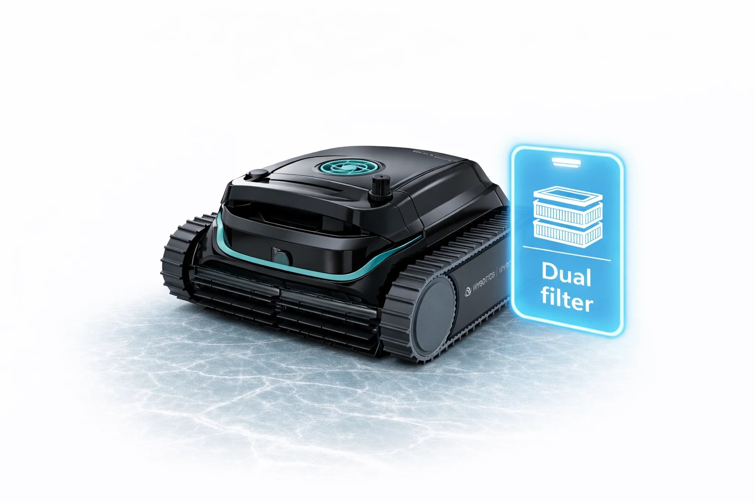 WYBOT M2 je osazen dvouvrstvým filtračním systémem a nepropustným designem, který účinně zachytí nečistoty, jako je prach, písek i listí, a zároveň brání jejich návratu zpět do vody. Bezkartáčový (bezkomutátorový) motor poskytuje silné sání a zvládne šplhat i po vertikálních plochách. Díky tomu je vhodný pro různé materiály bazénů – například dlaždice, beton nebo PVC.