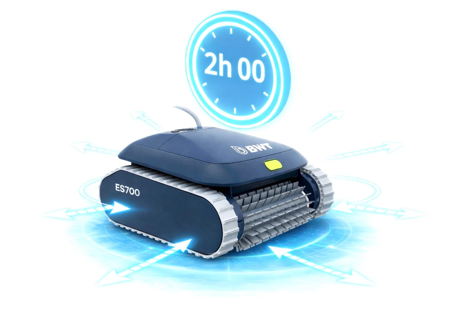 BWT ES700 spolehlivě čistí dno, stěny i hladinovou linku. Silný motor a účinný filtr zajišťují důkladné odstranění nečistot. Robot je vhodný pro bazény do délky 10 m – zapuštěné i nadzemní, s fólií, obkladem nebo jiným povrchem.