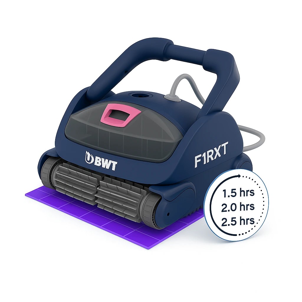 BWT F1 RXT pracuje v cyklech 1,5, 2,0 nebo 2,5 hodiny, takže je vhodný pro bazény až do délky 15 metrů. Plovoucí kabel Gen Core 7 o délce 23 m poskytuje velký rozsah pohybu a díky ochraně proti kroucení pomáhá předcházet zamotávání kabelu.