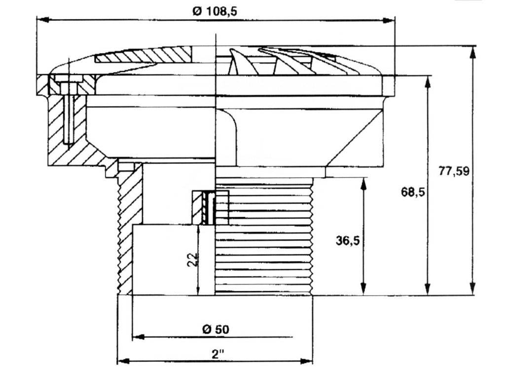 Podlahovou trysku je možno dovybavit nerezovou mřížkou. Tryska je vyrobena z bílého plastu ABS, má nastavitelný průtok 0--100% a je určena pro instalaci do dna bazénu. Jedná se o model do betonu. Kapacita průtoku 14 m3/h, napojení lepením 50 mm nebo 2“ ex.