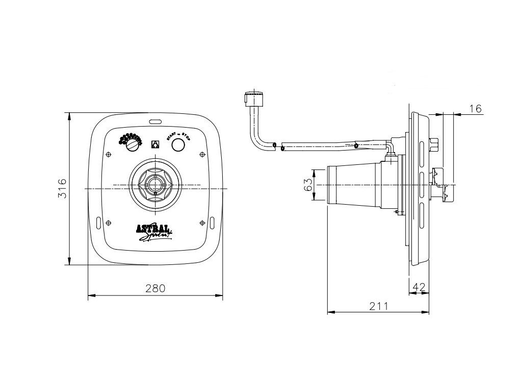 Obsahuje: Trysku pr.45 mm s čelním krytem z nerez oceli AISI-316 včetně plastové krabice a příruby s těsněním pro montáž ve fóliovém, nebo prefabrikovaném bazénu, ovládací skříňku a čerpadlo Astralpool 88 m3/h (kód 11509).