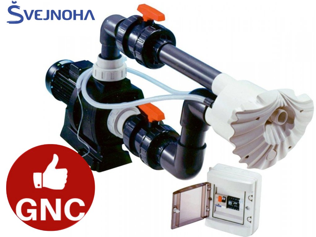 Vestavěný protiproud zařízení K-JET - Tento vestavný protiproud je předpřipraven k velmi snadné instalaci. V zařízení je možno regulovat intenzitu proudu vody a přisávání vzduchu, to vše na trysce o průměru 40 mm, která je též směrově nastavitelná. Tato tryska je spolu se sáním a pneumatickým spínačem v čelním krytu zařízení. Kompletní protiproudé zařízení K-JET obsahuje: