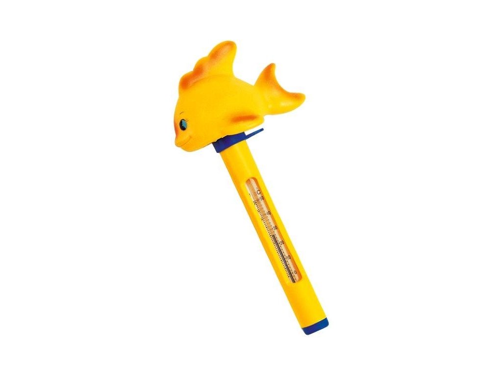 Plovoucí teploměr, slouží k měření teploty bazénové vody, doplněn provázkem k upevnění např. ke schůdkům