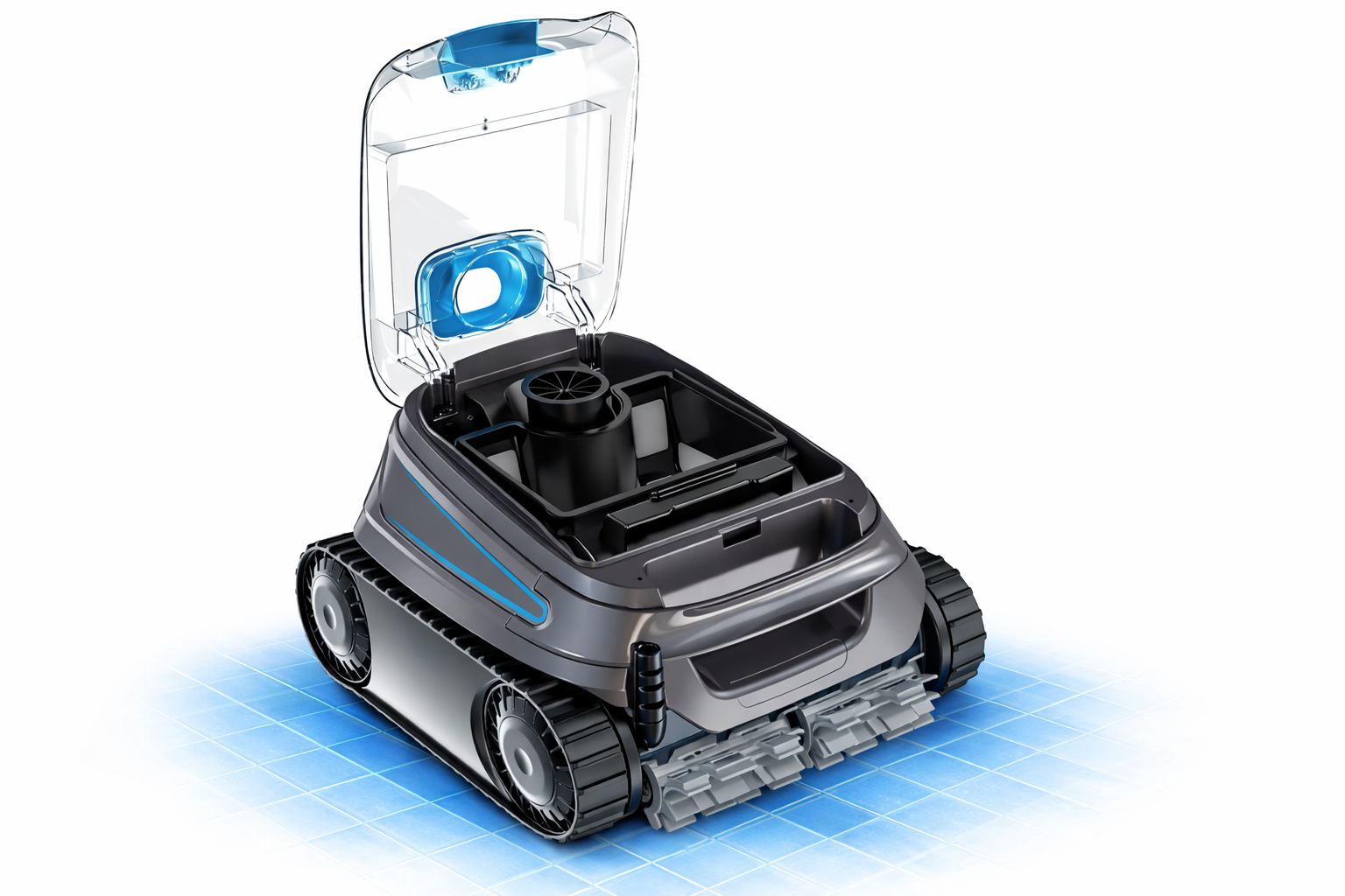Horní přístup k filtru usnadňuje jeho vyjmutí i vyčištění, takže pravidelná údržba zabere jen minimum času. Robot nabízí dva přehledné čisticí programy – 1 h 30 min pro samotné dno a 2 h 30 min pro kompletní čištění včetně stěn a hladinové linky.